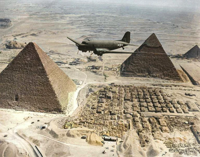Транспортный самолет США Douglas C-47 Skytrain пролетает над некрополем Гизы в Египте, 1943 год.