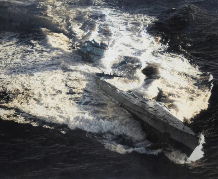 Последние мгновения перед затоплением немецкой подводной лодки U-185 после атаки глубинными бомбами американских самолетов. Атлантика, Вторая мировая война, 24 августа 1943 года.