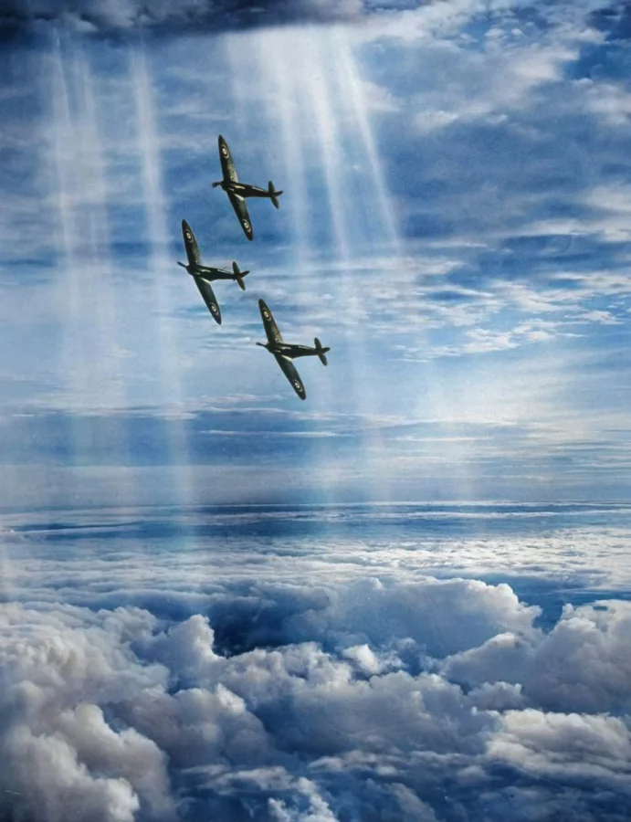 Британские истребители «Спитфайр» летят строем сквозь лучи солнца над облаками, 1939 год.
