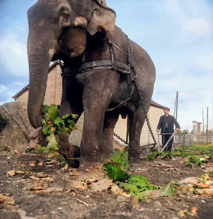 Слон из цирка братьев Амар пашет в оккупированной Франции, 1941 год.