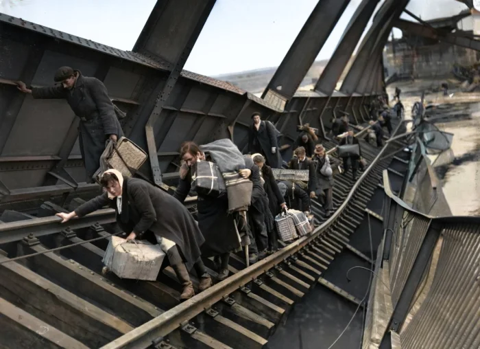 Люди пересекают мост через реку Эльба в Тангермюнде, взорванный немцами, чтобы спастись от хаоса за немецкими линиями, вызванного приближением наступающих советских войск, 1 мая 1945 года.