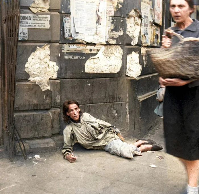 Женщина, умирающая от голода, лежит на асфальте в Варшавском гетто.