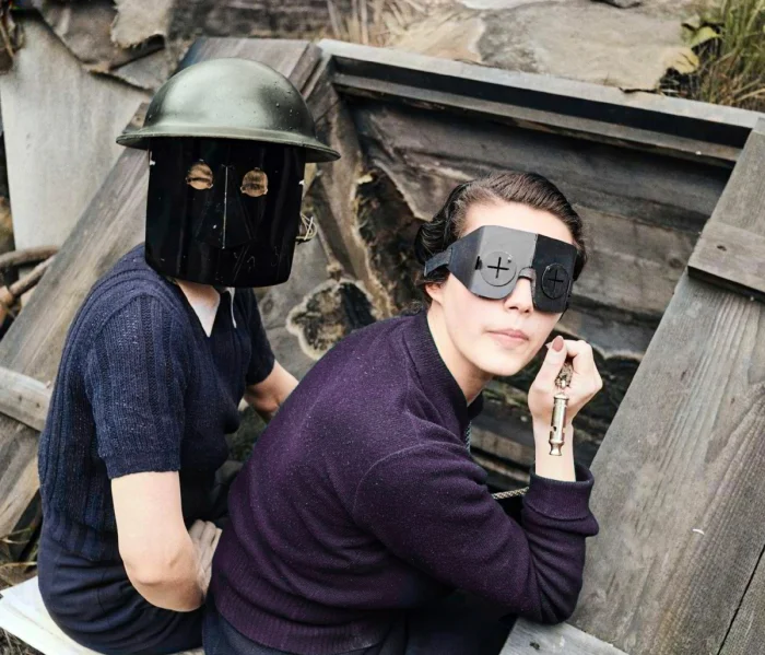 На снимке запечатлены женщины, ожидающие у входа в бомбоубежище во время немецких воздушных налётов на Лондон. Они носят специальные защитные маски, выданные гражданскому населению для предотвращения ожогов лица от зажигательных бомб. В руках у каждой — свисток, предназначенный для подачи сигналов спасателям в случае захоронения под обломками зданий. Эти меры предосторожности отражают повседневную реальность лондонцев во время Блица (массированных бомбардировок Великобритании в 1940–1941 годах).