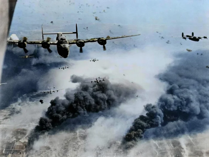 Бомбардировщики B-24 Liberator из 15-й воздушной армии (15th Air Force) США во время бомбардировки нефтеперерабатывающего завода «Конкордия Вега» (Concordia Vega) в Плоешти (Ploieşti),1944 год.