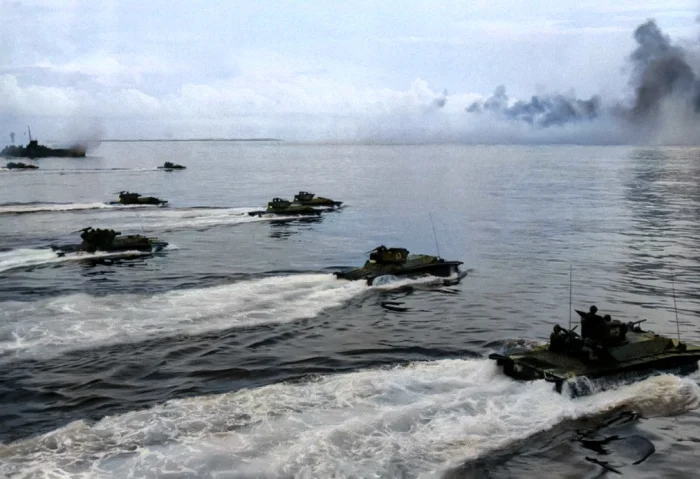Десантные корабли «Аллигатор» движутся к суше, 15 сентября 1944 года.