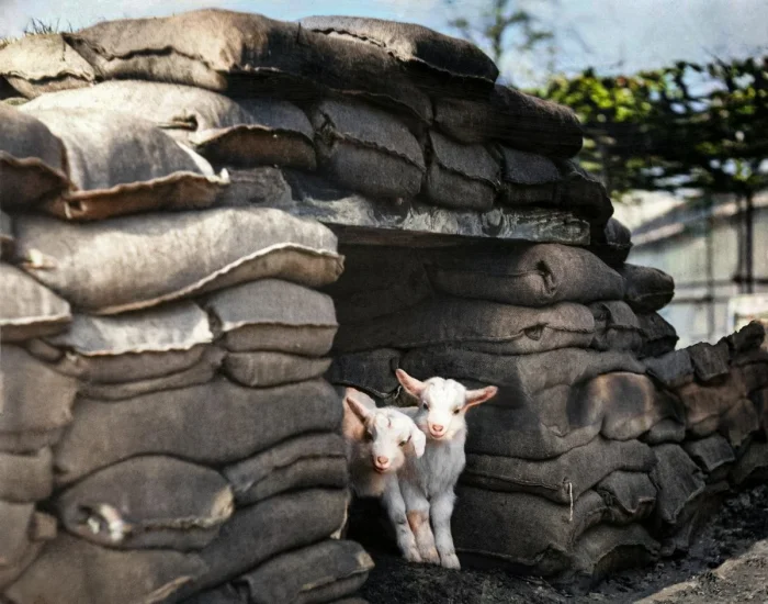 Козлята в Лондонском зоопарке защищенные мешками с песком во время Второй мировой войны. Март 1941 года.