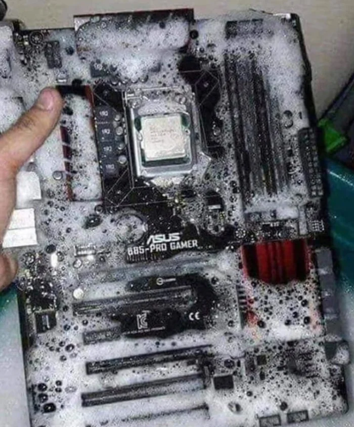 Требовалось почистить материнскую плату. Кто-то понял это совсем уж буквально