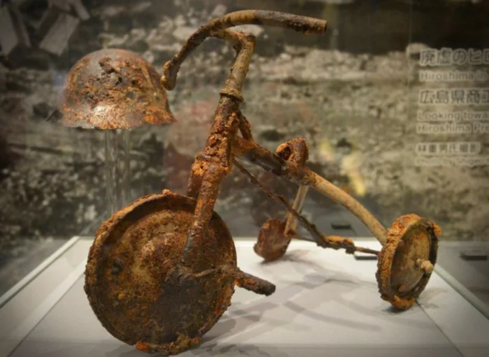 Велосипед и шлем, оставшиеся после ядерной атаки в Хиросиме