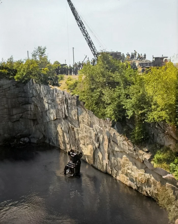 Автомобиль, изрешечённый пулями, с телом Томми Каррана, извлечённый из карьера Свинглз. США, 1933 год.