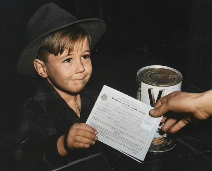 Американский ребенок получает паек по продуктовой книжке. США, 1943 год.