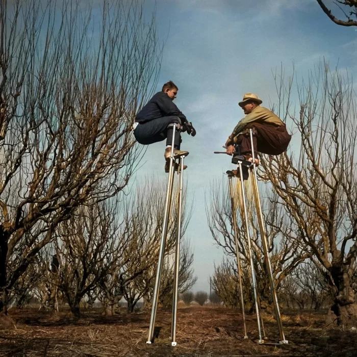 Двое американских рабочих, занимавшихся подрезкой плодовых деревьев, отдыхают, 1950-е годы.