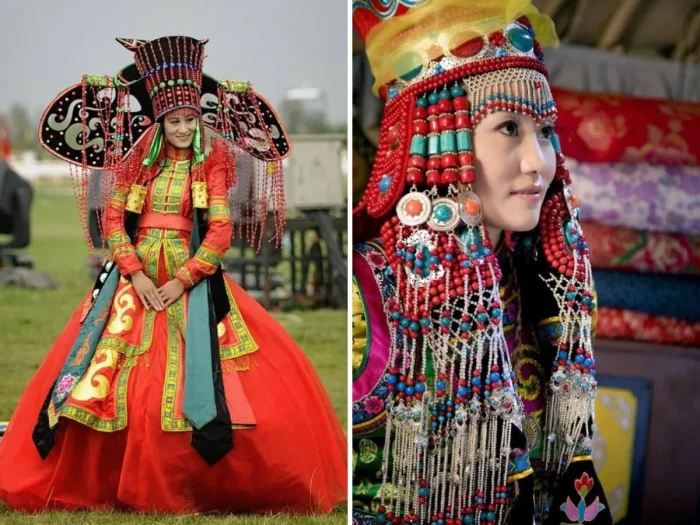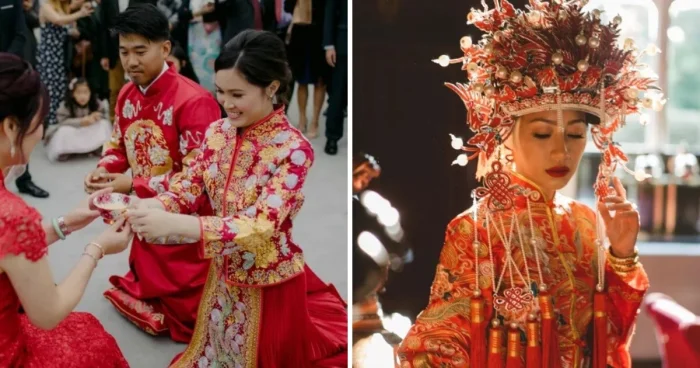 В Китае молодожёны традиционно одеваются в красные наряды, символизирующие счастье и процветание. Голову невесты украшает изысканный головной убор в виде феникса.