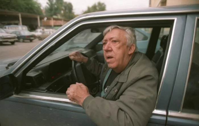 Юрий Никулин возвращается домой после работы на своём «Volvo». Москва, 1990 год.