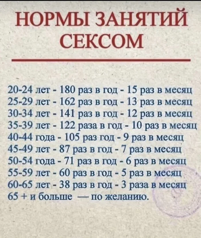 Вот только с нормами секса не соглашусь. Мне по этой таблице можно только 2 раза в неделю, а мне каждый день надо. Ждать как праздника? Чёзанах?