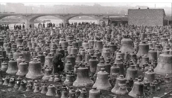Гитлера к власти приводят британцы и американцы. Финансируют по обе стороны. Англичане растят его против Советского Союза, а американцы против Великобритании. Но Гитлеру не хватает финансирования, поэтому англосаксы разрешают ему осуществить аншлюс богатейшей Австрии. Так у Гитлера появляются дополнительные деньги. А затем британцы отдают ему Чехословакию (промышленный и ресурсный центр бывшей Австро-Венгрии). Так у Гитлера появляется мощная военная промышленность. На фотографии церковные колокола, собранные немцами для переплавки в Праге. На дворе 1942 год. Германия снимает по всей стране тысячи колоколов.