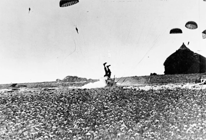 А на этой фотографии неудачное приземление американского парашютиста во время высадки 1-й воздушно-десантной армии союзников. Операция «Маркет-Гарден», 1944 год. Тогда американцы и англичане решили высадиться в Голландии. Всего 30 тысяч англосаксонских касок и ещё триста поляков. Немцев было 20 тысяч и они разбили англов.