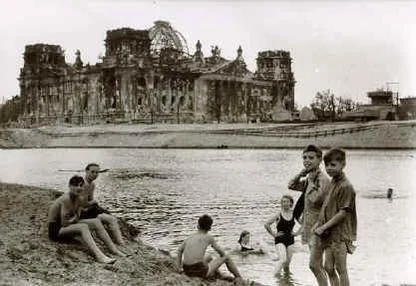А на этой фотографии дети купаются на фоне руин Рейхстага. Берлин, 1945 год.