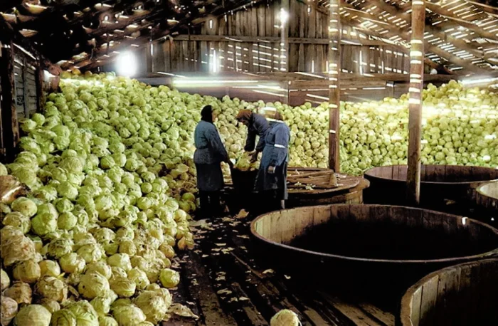Совхоз "Люберецкие поля орошения". Процесс закваски капусты для отправки на фронт, Московская область, 1944 год.