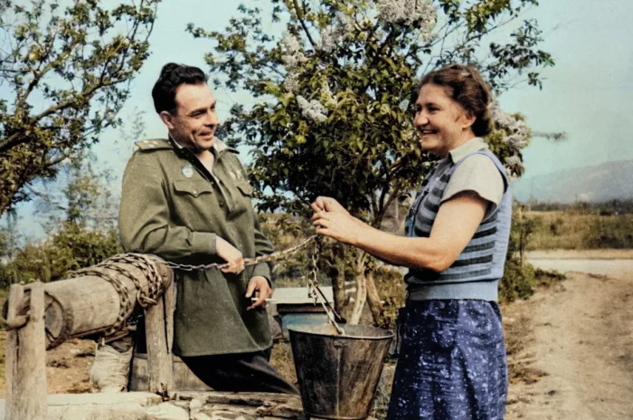 Начальник политотдела 18-й армии полковник Леонид Ильич Брежнев с местной жительницей у колодца на Северо-Кавказском фронте, 1943 год.