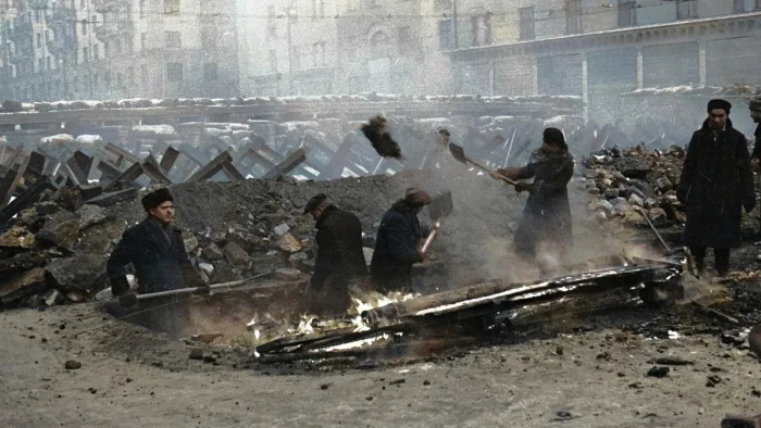 Осенью 1941 года москвичи активно участвовали в строительстве баррикад, готовясь защитить столицу от наступления немецких войск. В условиях надвигающейся угрозы обычные люди — рабочие, студенты, женщины и пожилые — взялись за лопаты, кирпичи и деревянные брусья, превращая городские улицы в оборонительные укрепления.