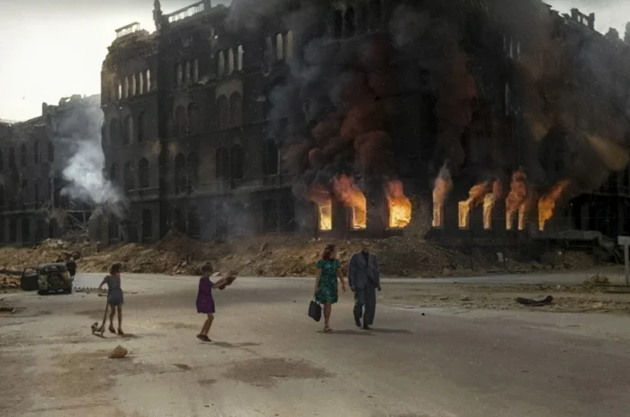 Фотография была сделана в послевоенный период, когда город восстанавливался после разрушений. Этот город, переживший одну из самых масштабных и кровопролитных битв в истории — Сталинградскую, был практически стерт с лица земли. Однако благодаря невероятным усилиям миллионов людей он смог возродиться из руин.