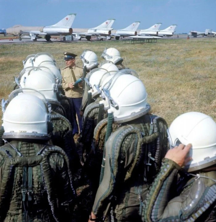 Майор Юрий Козлов проводит инструктаж для молодых пилотов перед высотным полетом, 1970 год