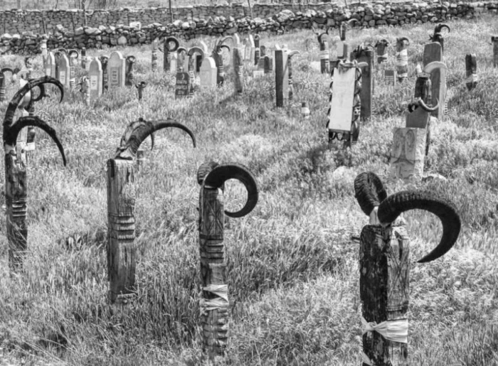 Кладбище в горной деревне, где могилы украшены рогами горных козлов, Туркменистан