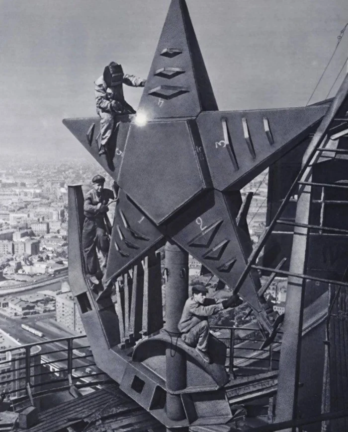 Рабочие монтируют звезду на шпиле, высотное здание на Котельнической набережной, Москва, 1951-й
