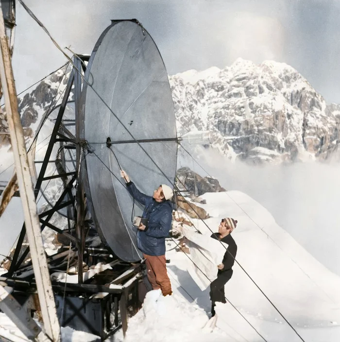 Инженеры Киргизского радио-телецентра настраивают антенну ретрансляционной станции "Южная", расположенной на одной из вершин Тянь-Шаня, 1974 год.