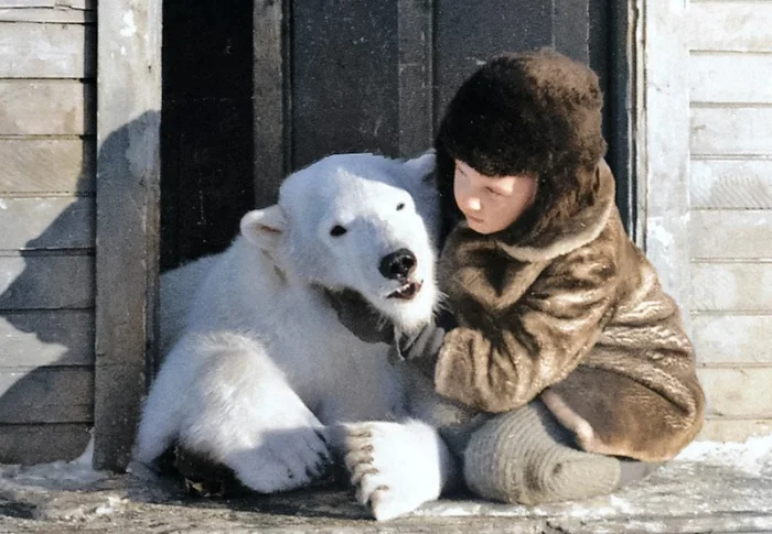 "Подружки". Медвежонок Айка и девочка Вероника Ледина. Земля Франца-Иосифа, остров Хейса. 1974 год.