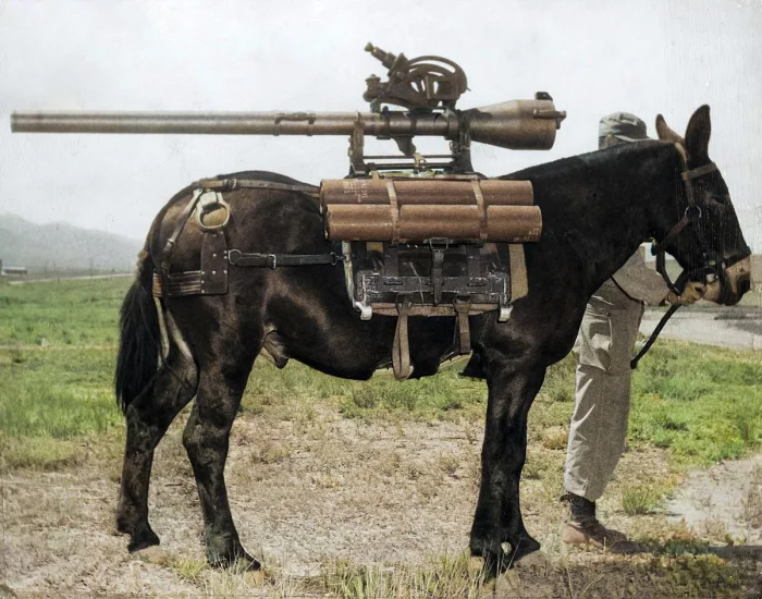 Безоткатное орудие, установленное на муле. Форт Ливенворт, Канзас, 1947 год.