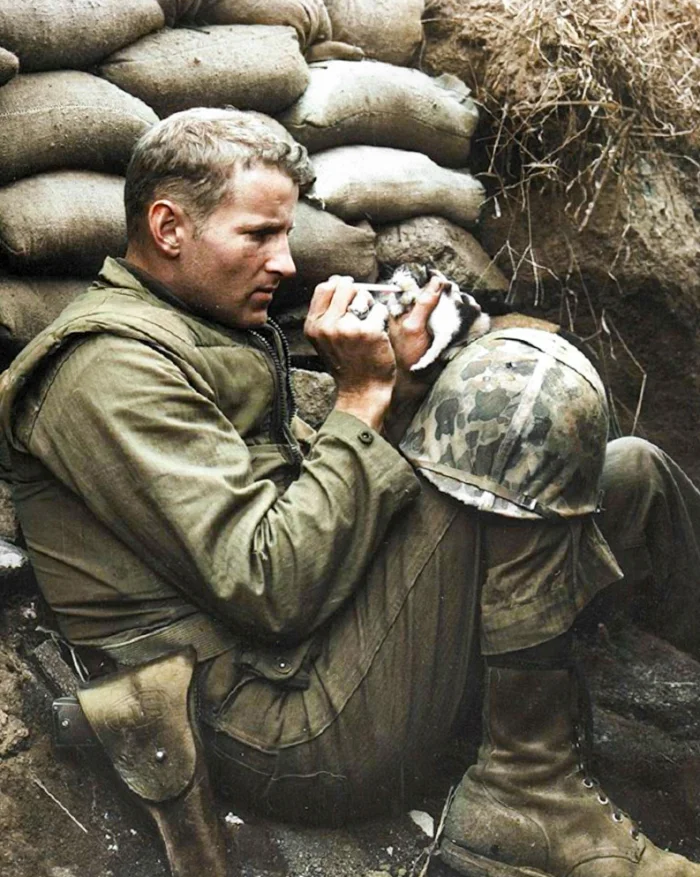 Солдат кормит котёнка, Корейская война, 1953 год.