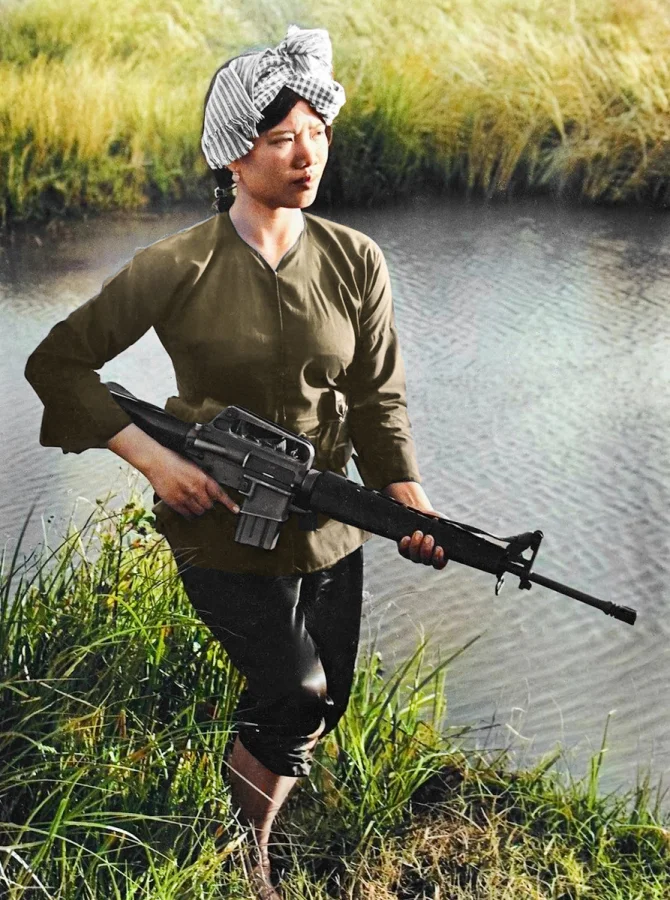 Вьетнамская девушка-партизанка с винтовкой М16. Вьетнам, 1973 год.