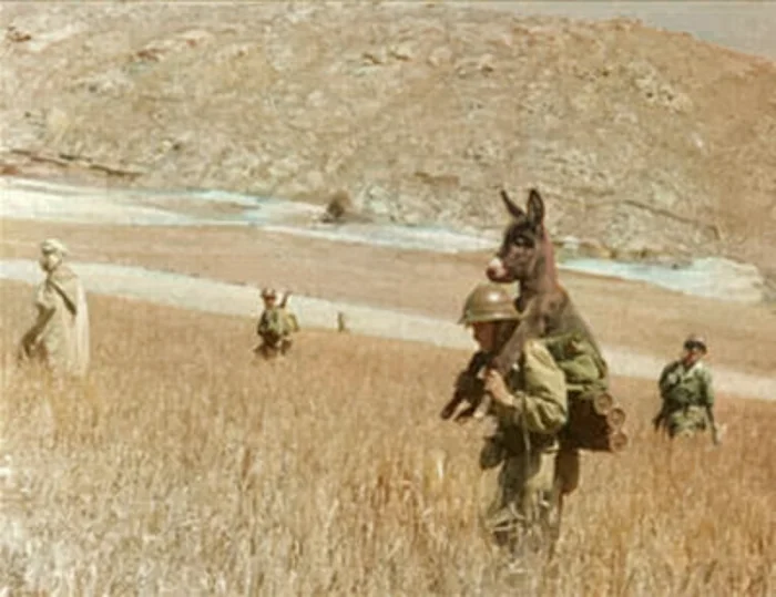 Фотография датируется 1958 годом и была сделана во время Алжирской войны (т. е. войны за независимость, которая велась против французских войск в колониальном Алжире). И на ней изображен голодающий осел, которого спас член Французского Иностранного легиона. Он отнес его на свою базу, где животное выходили и сделали талисманом подразделения. Осел получил кличку «Бэмби».