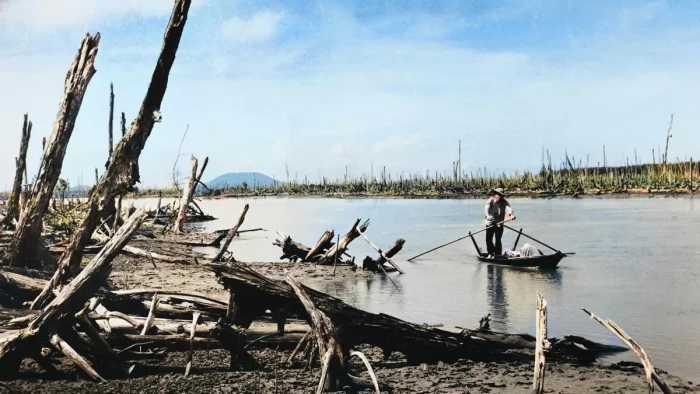 Вьетнамец плывущий на лодке в дельте р.Меконг. На берегах лес, уничтоженный химическим оружием под названием "Agent Orange". Вьетнам, 1970 год.