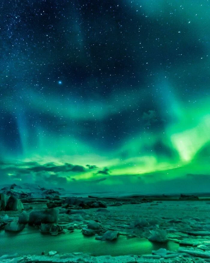 20. Северное сияние над ледяной лагуной Йёкюльсаурлон в Исландии