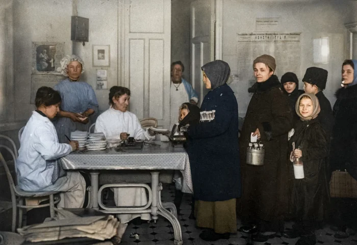 Бесплатная раздача молока для детей. Петроград, 1920 год.
