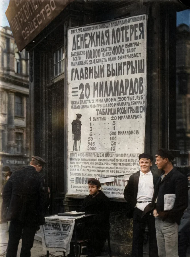 Продажа студентами-рабфаковцами лотерейных билетов в помощь инвалидам на праздновании 25 Октября. Петроград, 1921 год.
