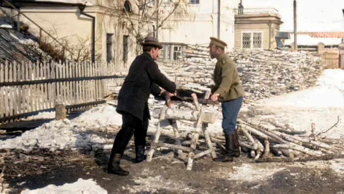 Николай II и Пьер Жильяр пилят дрова во время ссылки. Тобольск, 1917-1918 год.
