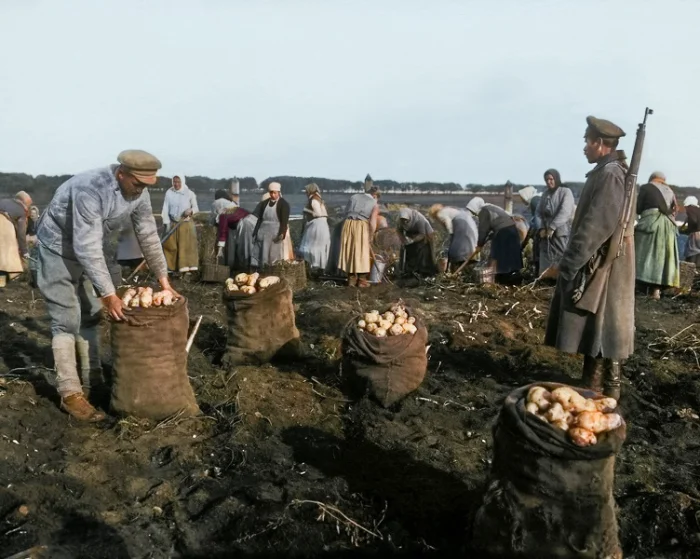 Крестьяне собирают картофель под наблюдением вооруженной охраны, 1918 год.