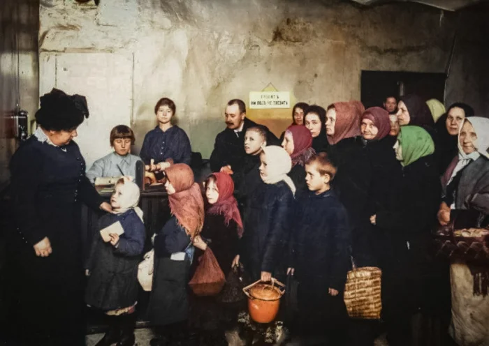 Раздача обеда в столовой 3-го Городского попечительства о бедных. Петроград. Российская империя, 1916 год.