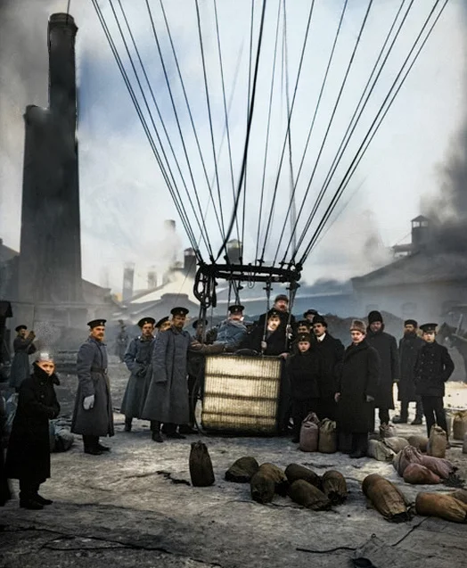 Члены Императорского Всероссийского аэроклуба у гондолы воздушного шара. Санкт-Петербург, 1909 год.