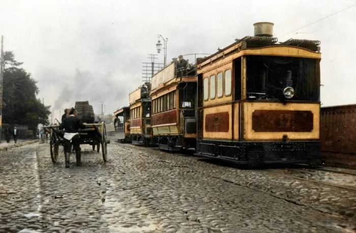 Шлиссельбургский проспект. Паровой трамвай Невской линии. Санкт-Петербург, 1915 год.