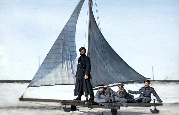 Группа офицеров гвардейских частей Раяйокского отряда на буере объезжают пограничный участок, 1908 год.