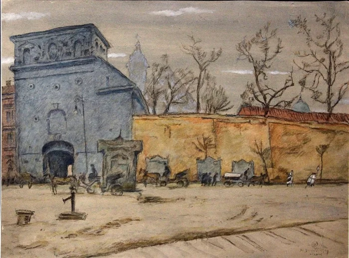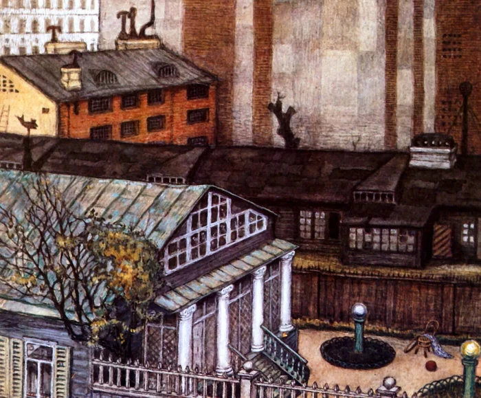 Меня и теперь удивляет, почему меня привлекала эта сторона Петербурга, а не его красота, которую я так любил с детства и продолжал любить уже сознательно; меня больше в ту пору пленяли эти далекие от "красивости" черты Петербурга. Я любил выбрать такую точку зрения, чтобы композиция была острой, небанальной, и тут все время передо мной был пример Хирошиге. Я продолжал рисовать "мой" Петербург для себя, и может быть, и естественно для моих настроений того времени, что мой вкус останавливался тогда на формах таких простых и даже суровых, лишенных всякой "красивости", как та стена. И все больше и больше меня влекло изображать графически сам по себе четкий и геометрический Петербург. Ничто не мешало мне сосредоточиваться в те свободные часы, когда я с жадностью торопился рисовать. Моя семейная жизнь с ее уютом давала мне полное равновесие и душевный покой».