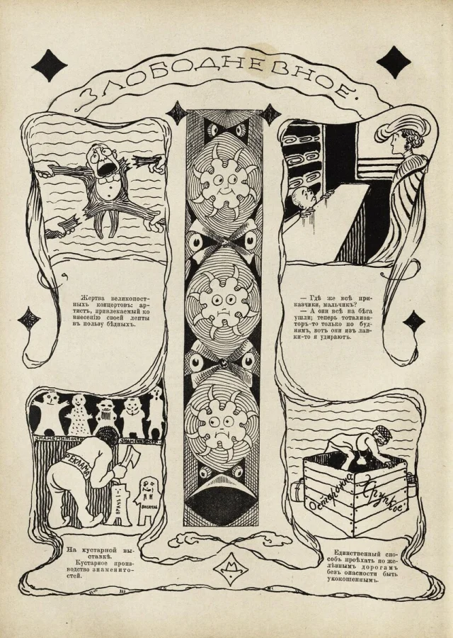 О работе в «Шуте» он позже вспоминал так: «Глупее всего было то, что, закабалив себя ради жалования, я на своей службе не получал пока ни копейки! Полагалось выдержать какой-то законный срок! Но как раз именно под крышей этого допотопного учреждения неожиданно открылся источник небольшого постороннего и постоянного заработка. Среди моих скучных и сонных геморроидальных сослуживцев оказался один жизнерадостный молодой человек Мазуркевич, круглолицый и румяный, с эспаньолкой и в золотом пенсне со шнурком, хохотун и анекдотист и вдобавок стихотворец — совсем роза среди чертополоха… От скуки я раз не утерпел и нарисовал в карикатурном виде одного из чиновников. М[азуркевич] подглядел карикатуру, и ему пришла блестящая мысль делать вместе со мной еженедельную страницу в “Шуте” — “недельные (это казалось, вероятно, ужасно остроумно) наброски”, — и стал меня соблазнять верным заработком. И увы, как меня ни коробило сотрудничество в этом пошловатом издании, я скрепя сердце согласился. Рисовал я “инкогнито” — вместо подписи ставил монограмму “М. Д .”, которая походила на шляпу, и, хотя злободневные темы были самые плоские, меня занимало выдумывать общую страничную композицию и упражняться в чистоте штриха». Художник пытался поступить в Академию художеств, но попытка не увенчалась успехом.