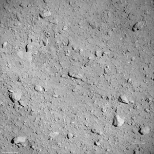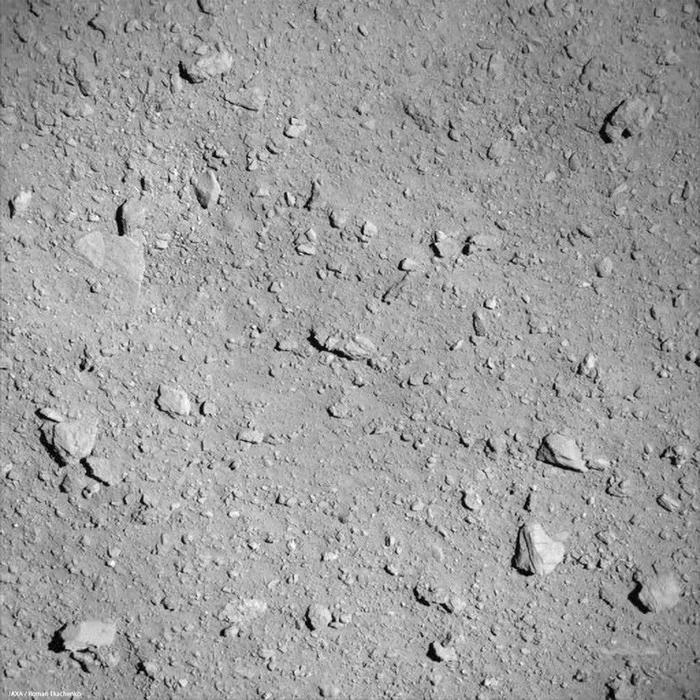 На этом изображении запечатлена неровная, первозданная поверхность Рюгу, богатая углеродистыми материалами. Снимок был сделан до того, как у MASCOT разрядилась батарея, и он дал уникальную возможность взглянуть на нетронутую геологию астероида.
