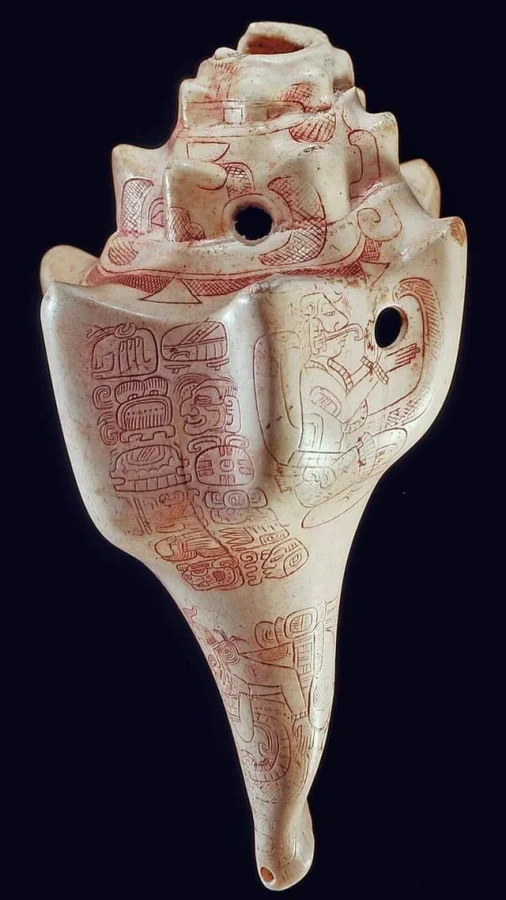 Сделана из раковины и инкрустированная гематитом. Из Петена в Гватемале, 4-6 века н.э., ныне хранится в Музее искусств Крайслера в Норфолке, штат Вирджиния.
