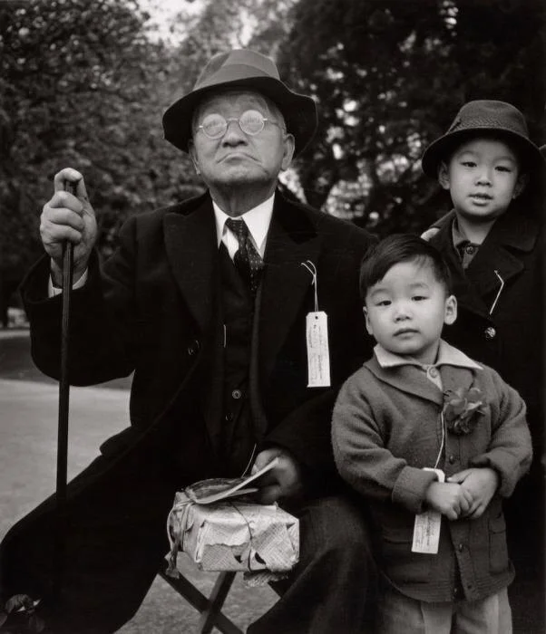 Дедушка и внуки ждут эвакуационный автобус, Хейворд, Калифорния», 1942, Художественный музей Нельсона-Аткинса, Канзас-Сити, Миссури