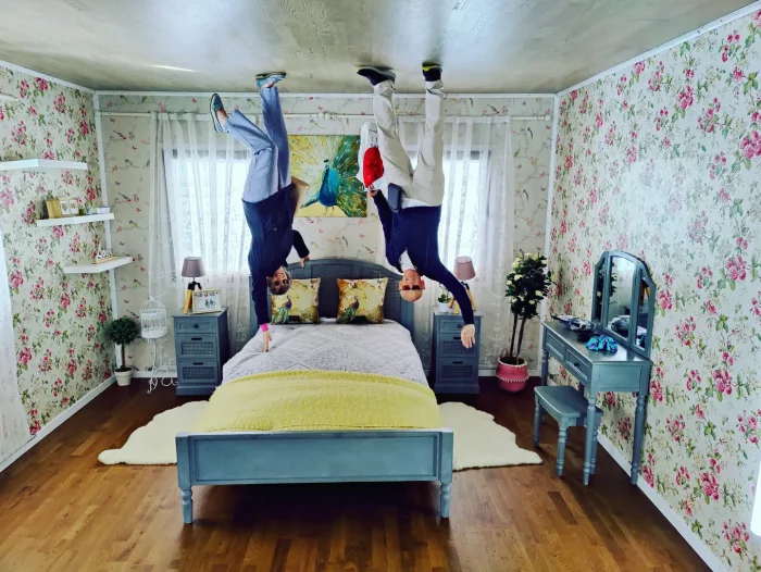 Этот дом, буквально «стоящий на крыше», создает эффект гравитационного хаоса: мебель, лестницы и даже камин установлены вверх ногами, заставляя посетителей ощущать себя героями сюрреалистического мира.
